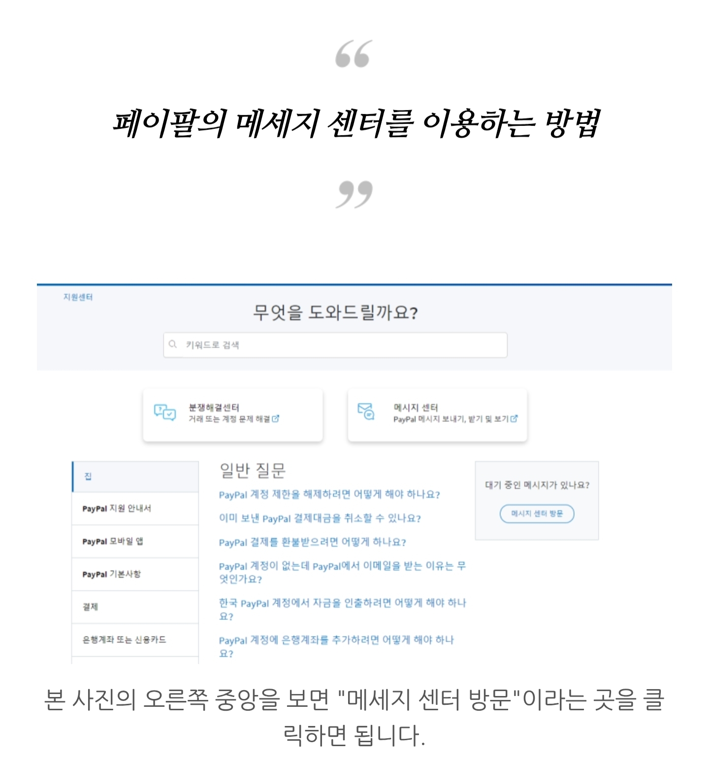 페이팔 계정을 생성하면 화면의 중앙 하단에 "문의하기"를 클릭하면 상단의 도움 페이지가 나오고 페이지의 오른쪽 중앙에 "메세지 센터 방문"을 클릭하면 메세지로 상담을 할 수 있게 됩니다.