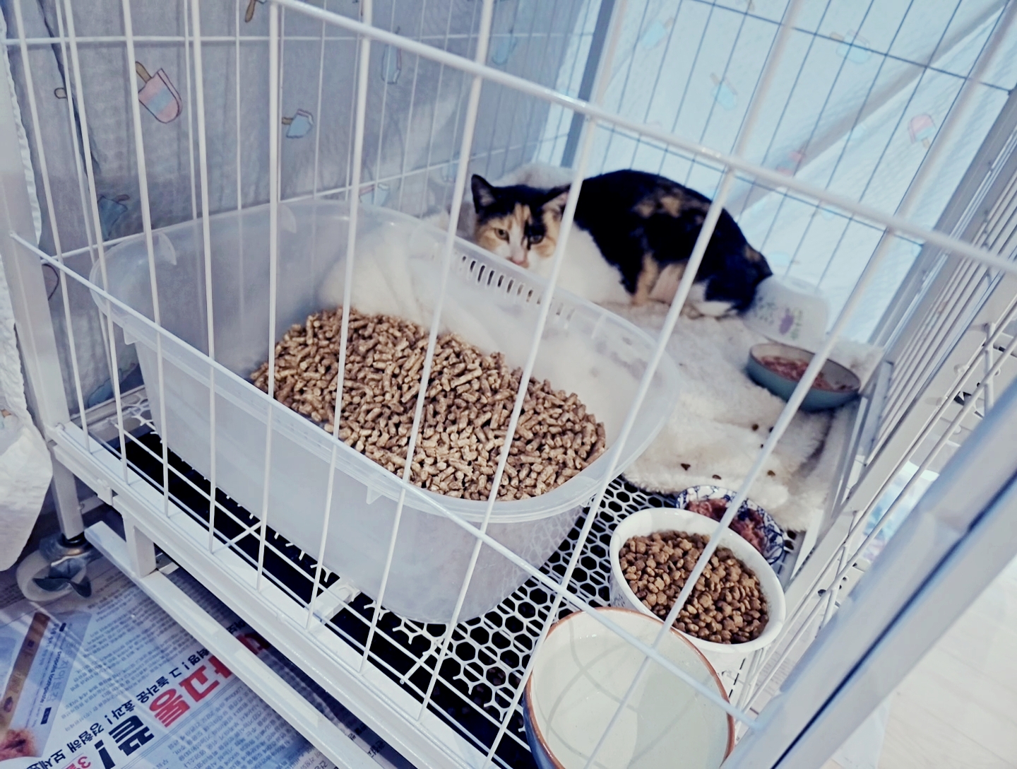 철제케이지안에 푹신한 방석을 깔아놓고, 작은 화장실통에는 펠릿이나 고양이 모래를 깔아서 준비해놓는다.