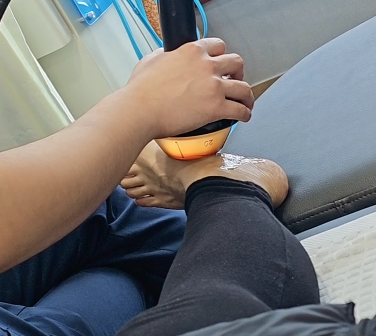 주사실에서 발등 부위 ( 아픈부위에 직접적으로 주사약물을 주입한다. )에 주사를 맞은후 병원의 물리치료실로 이동해서 체외충격파 시술을 받았다.